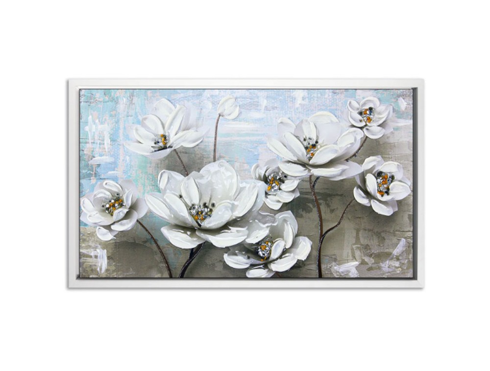 Blumenbild, gedruckt auf hochwertigem Polymerpapier und auf eine MDF-Platte mit hoher Dichte aufgebracht. Jedes Bild ist vollständig von Hand mit glänzenden Harzen, Kristallen und farbigen Steinen verziert. Ton-in-Ton-Pinselstriche und Strukturpasten setzen zusätzliche Akzente. Der Rahmen, erhältlich in Gold, Taubengrau oder Weiß, ist im Lieferumfang enthalten. Ideal für Küche, Wohnzimmer und Schlafzimmer.