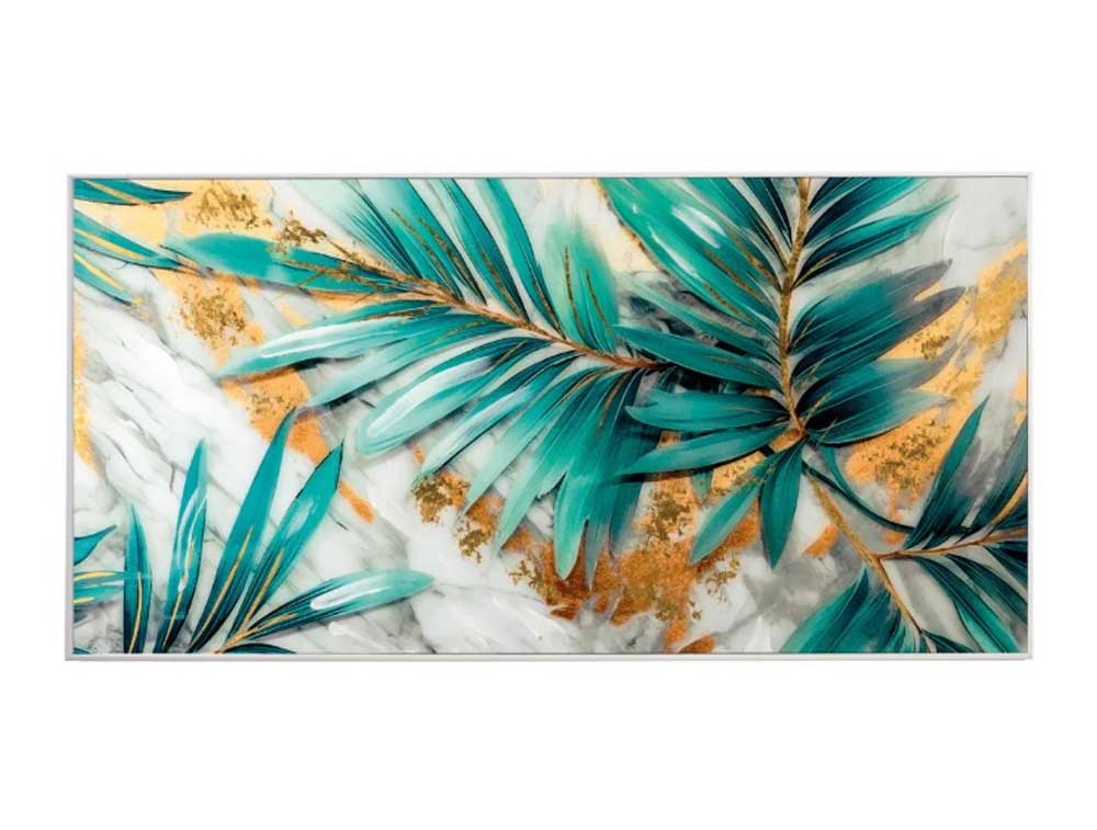 Dieses Gemälde vereint exotische Naturelemente mit der Opulenz edler Materialien und schafft so einen eindrucksvollen Blickfang. Es vermittelt sofort ein Gefühl von Frische, Vitalität und raffinierter Eleganz. Ideal für Räume mit neutralen Wänden oder kühlen Farbtönen wie Blau oder Grau. Versandkostenfrei und 2 Jahre Garantie.