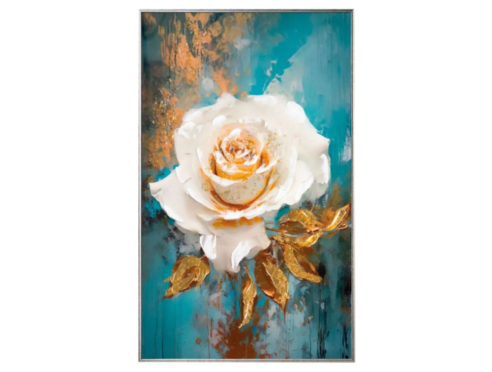Blumenbild, gedruckt auf hochwertigem Polymerpapier und auf eine MDF-Platte mit hoher Dichte aufgebracht. Jedes Bild ist vollständig von Hand mit glänzenden Harzen, Kristallen und farbigen Steinen verziert. Ton-in-Ton-Pinselstriche und Strukturpasten unterstreichen die besondere Wirkung. Ein Rahmen in Gold, Silber oder Weiß ist im Lieferumfang enthalten. Ideal für Küche, Wohnzimmer und Schlafzimmer.