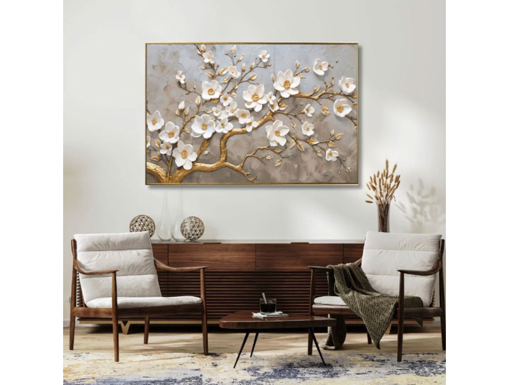 Ein modernes und haptisch ansprechendes Kunstwerk, das Malerei auf Leinwand mit geprägten Materialien kombiniert und so einen starken 3D-Effekt erzeugt. Haptischer Luxus, Strukturkunst, moderner Glamour oder botanischer Luxus – dieses Bild ist die perfekte Ergänzung für Eingangsbereich oder Wohnzimmer, wo Sie einen Blickfang mit einem einzigartigen visuellen und haptischen Erlebnis wünschen. Versandkostenfrei und 2 Jahre Garantie.