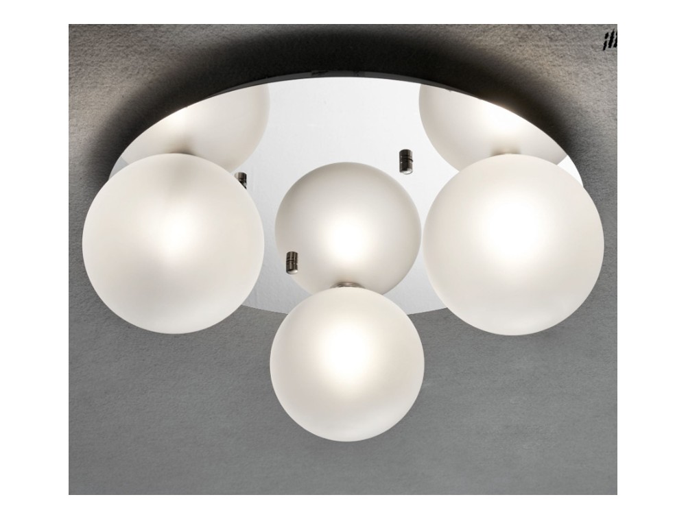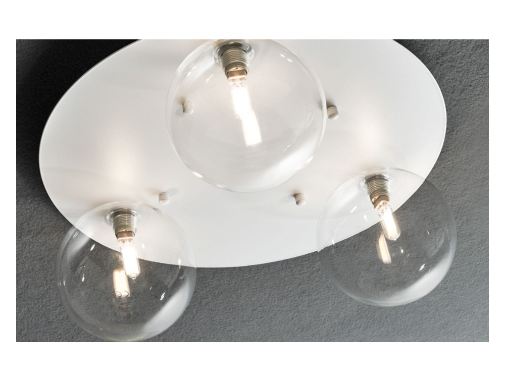 Deckenleuchte mit Metallrahmen in Weiß, Schwarz, Satingold und Chrom. Kugelförmige Diffusoren mit 14 cm Durchmesser, erhältlich in Bernstein-, Rauchglas, Klarglas und Satinglas. Kugeln mit 22 cm Durchmesser sind auf Anfrage ebenfalls erhältlich. Ideal für Eingangsbereiche oder Flure, wo die Deckenhöhe begrenzt ist, aber dennoch ein Hauch von Stil gewünscht wird. Passt perfekt in moderne Wohnzimmer, wo sie sich ideal mit minimalistischen Möbeln, lackierten Oberflächen oder Metalldetails kombinieren lässt, und in Schlafzimmer, wo das sanfte Licht der opaken Kugeln eine entspannende Atmosphäre schafft.