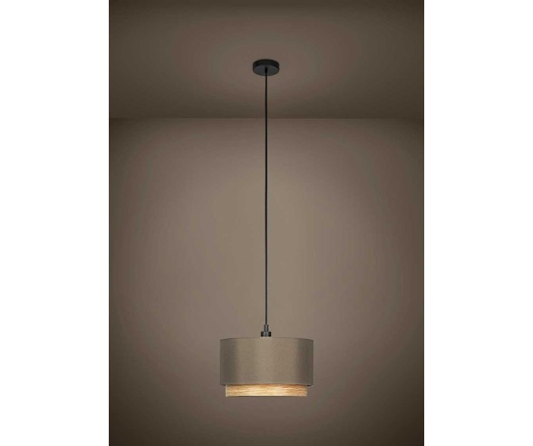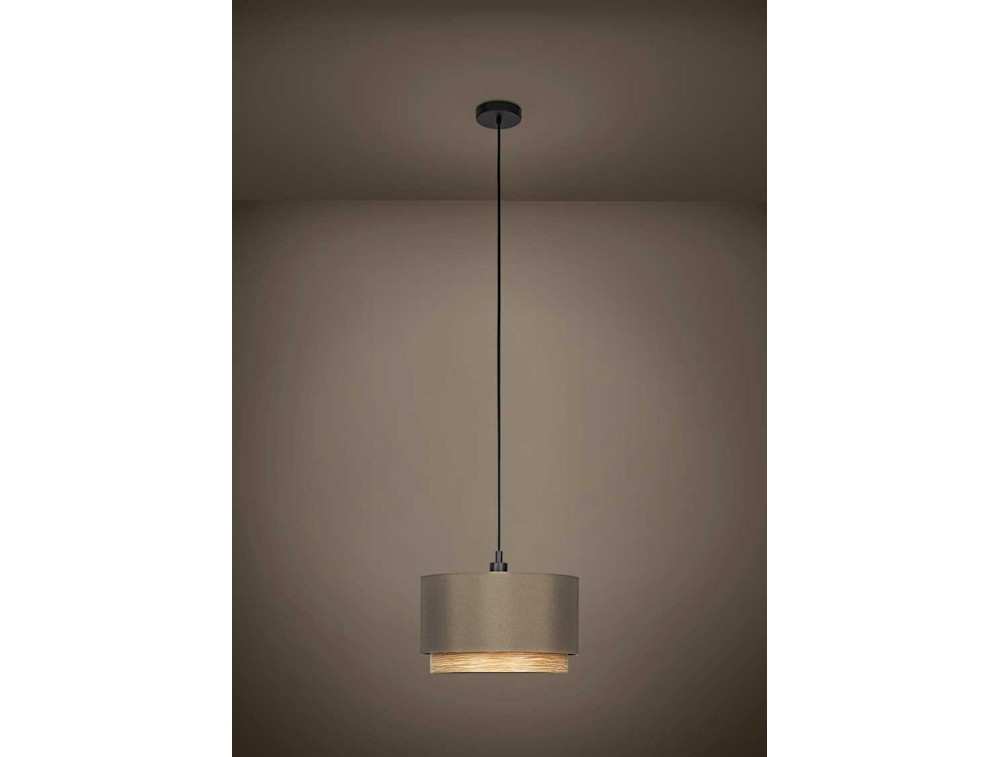 Die Pendelleuchte MARCHENA besteht aus zwei ineinander gesteckten runden Lampenschirmen, die mit einem schwarzen Stoffkabel an einem Metallsockel hängen.