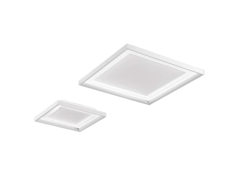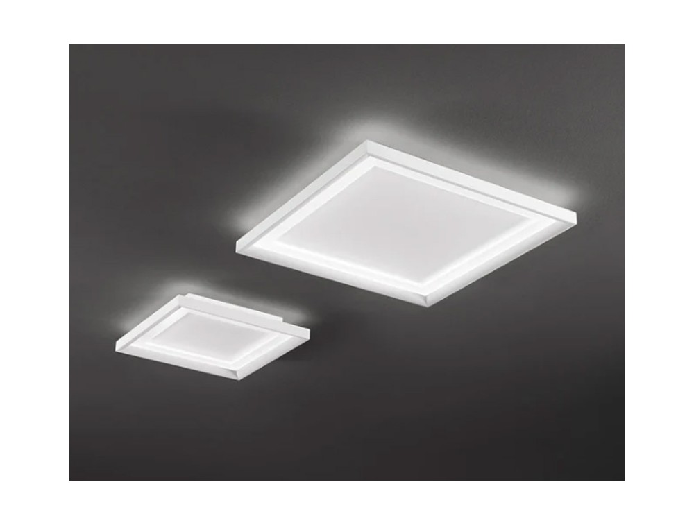 Die Decken-/Wandleuchte mit Metall- und Aluminiumrahmen ist hell, quadratisch und minimalistisch gestaltet. Sie besteht aus einem schlichten Panel, das von einem doppelstrahligen Leuchtrahmen umgeben ist. Das Licht wird sowohl nach unten als auch nach oben gestreut und erzeugt so einen eleganten Reflexionseffekt an der Wand.