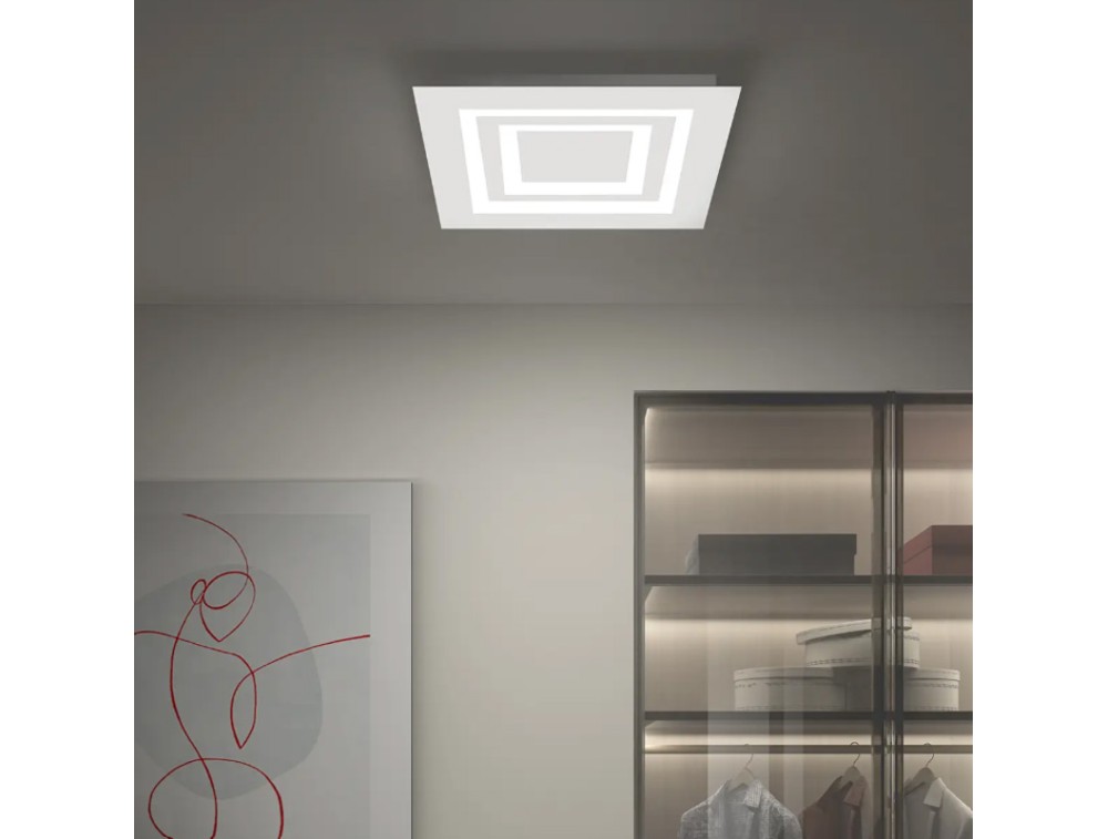 Quadratische Deckenleuchte mit lackiertem Metallrahmen und Methacrylat-Diffusor. LED mit integrierter Dimmfunktion für eine individuelle Lichttemperatur. Ideal für die Dekoration und Beleuchtung von Küchen, Fluren, Wohn- und Schlafzimmern.