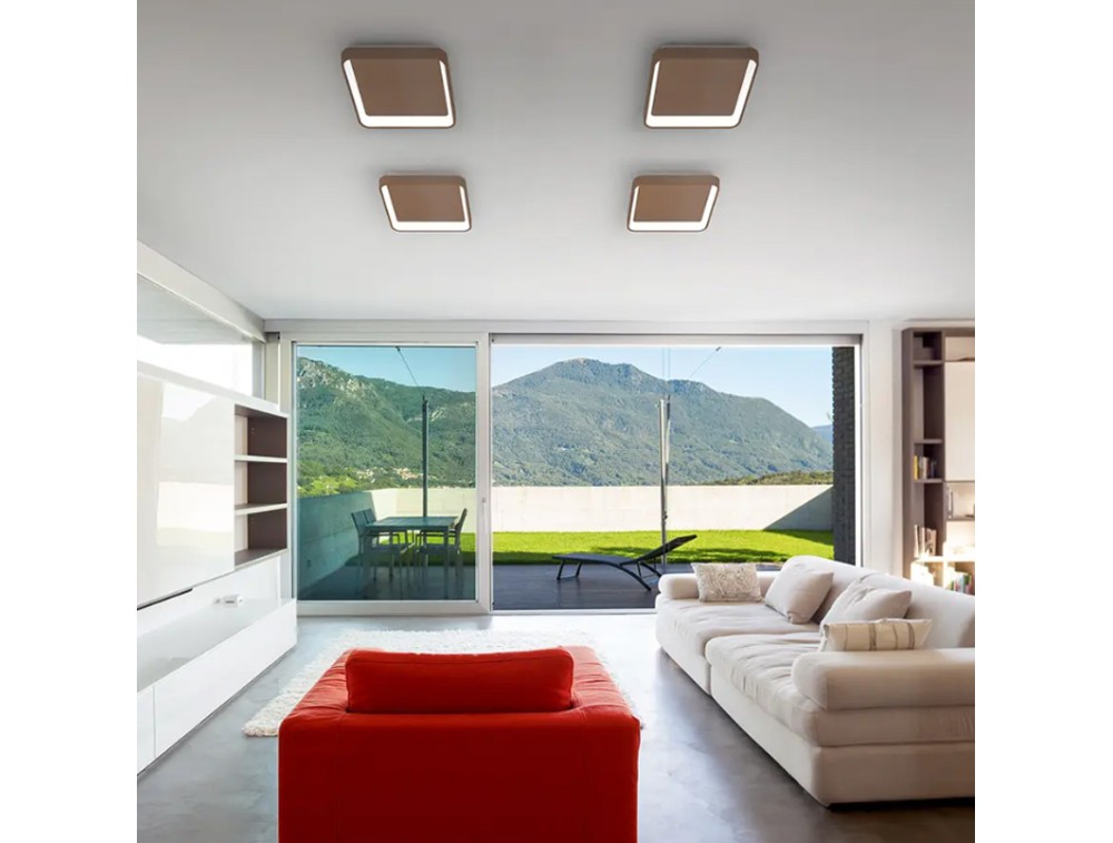 Quadratische Deckenleuchte mit lackiertem Metallrahmen und Methacrylat-Diffusor. Integrierte dimmbare LED ermöglicht eine individuelle Lichttemperatur für jeden Anlass. Ideal zur Dekoration und Beleuchtung von Küchen, Fluren, Wohn- und Schlafzimmern.