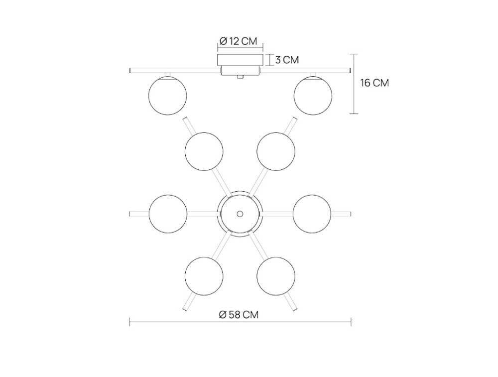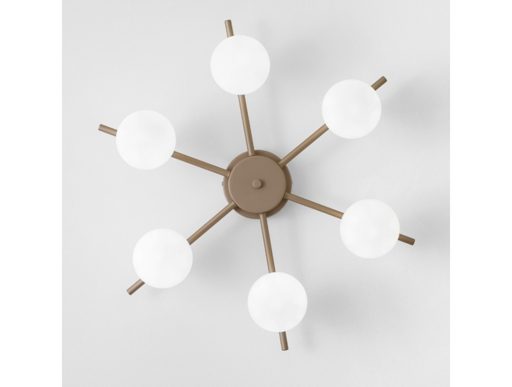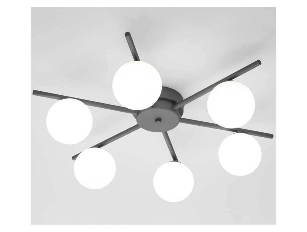 Sternförmige Deckenleuchte mit 6 Leuchten. Korpus aus Eisen, kugelförmige Glasdiffusoren. Erhältlich in verschiedenen Ausführungen, darunter Anthrazit und Sand. Sie verkörpert einen minimalistischen und modernen Stil mit Fokus auf klare Geometrie und dem Kontrast zwischen strengen Linien und weichen Formen. Dank des Opalglases wird das Licht gleichmäßig um 360 Grad um jede Kugel verteilt, wodurch direkte Blendung vermieden und eine sanfte Atmosphäre geschaffen wird.