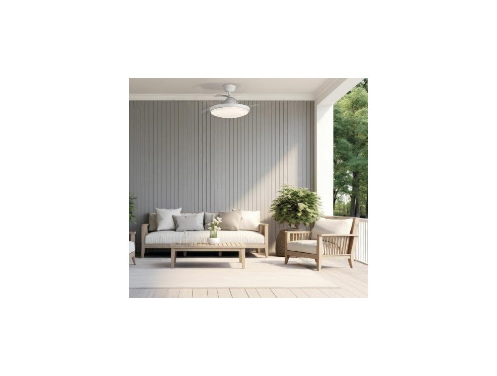 Deckenventilator mit Licht, ausgestattet mit 3 ABS-Flügeln. Weiße Farbe. Der Ventilator kann per Fernbedienung oder Timer gesteuert werden. Klappbare Klingen für ein minimalistisches Design.