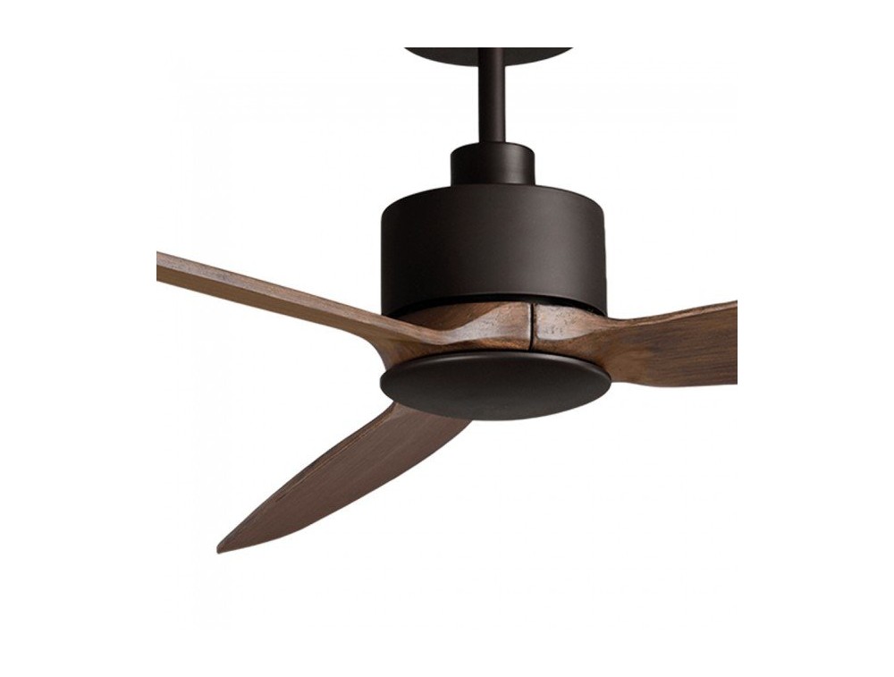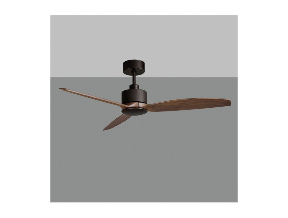 Deckenventilator mit 3 Holzflügeln. Schwarze Farbe. Der Ventilator kann per Fernbedienung oder Timer gesteuert werden.