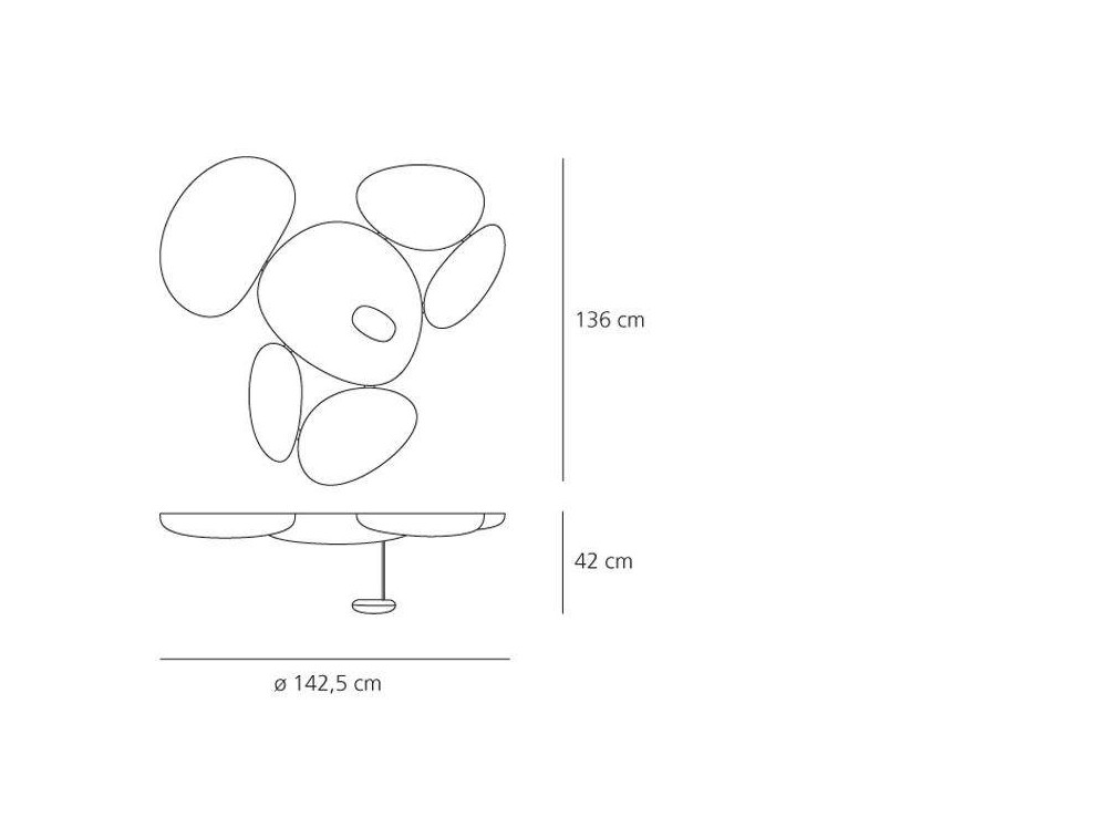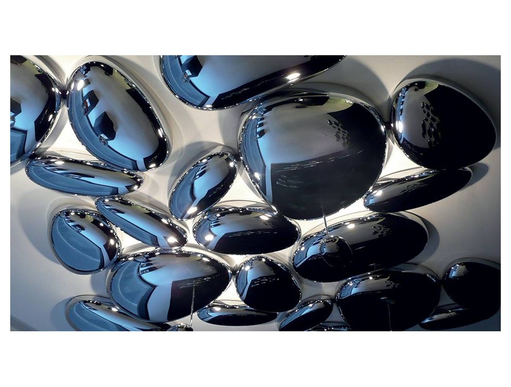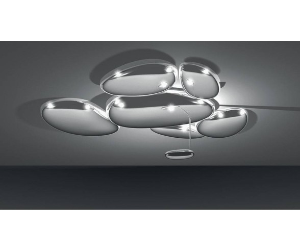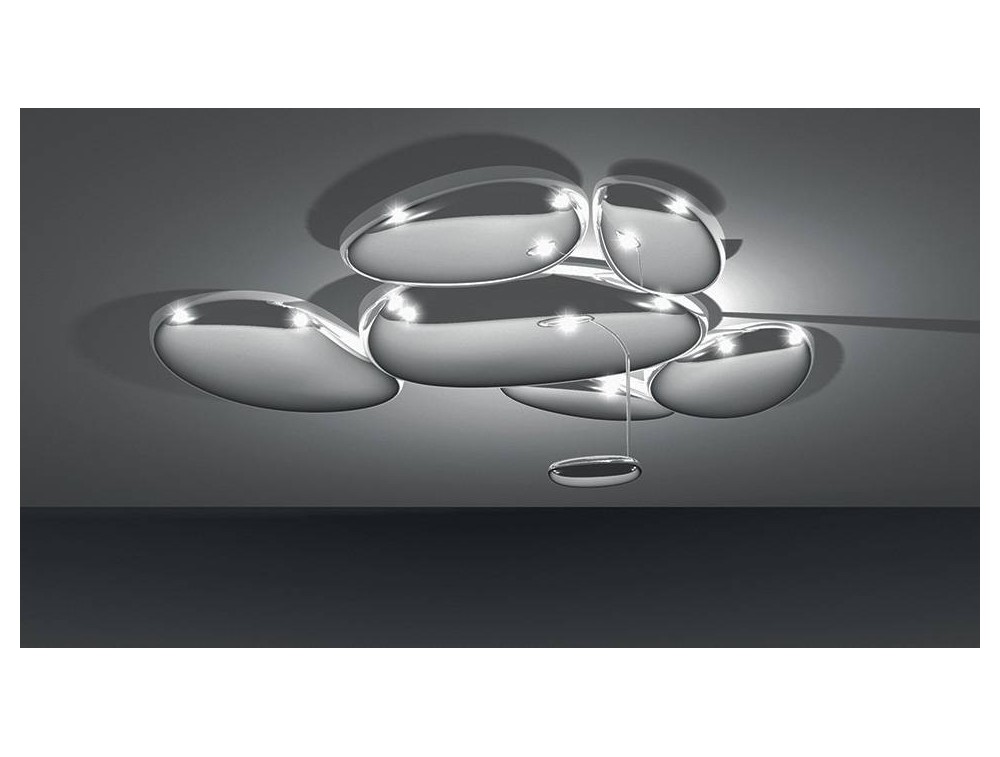 Deckenleuchte mit Stahlstruktur und Leuchtenkörper aus Aluminiumdruckguss und Spritzguss-Diffusoren aus ABS. Eine Reihe von Kieselsteinen bildet einen leuchtenden Himmel, der das Licht reflektiert, das auf seinen biomorphen Oberflächen zurückprallt. Ideal in Designumgebungen wie Wohnräumen, Wohnbereichen, Schlafzimmern und sogar öffentlichen Plätzen.