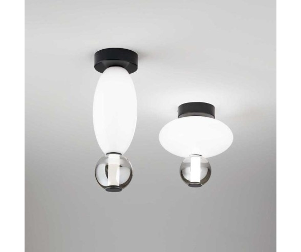 Der zentrale röhrenförmige Diffusor, verziert mit dekorativen Elementen aus glänzend weißem und transparentem grauem mundgeblasenem Glas, schafft eine einzigartige Atmosphäre aus diffusem Licht und verleiht jedem Kontext einen Hauch von Eleganz.