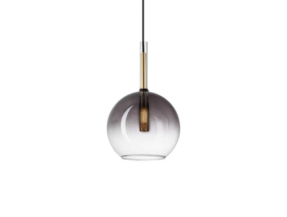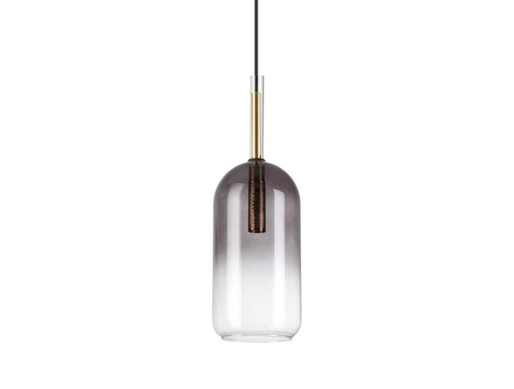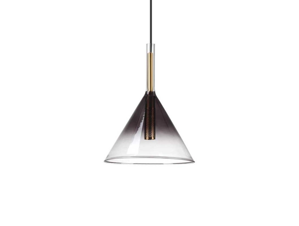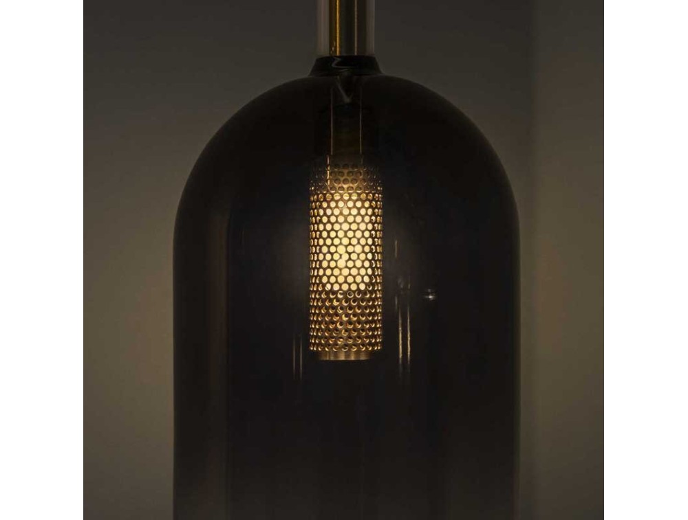 Rahmen und Rosette aus vergoldetem Metall mit Magnetverschluss ohne Schrauben. Schwarzes PVC-Kabel. Transparenter Glasdiffusor mit grauem Schirm.