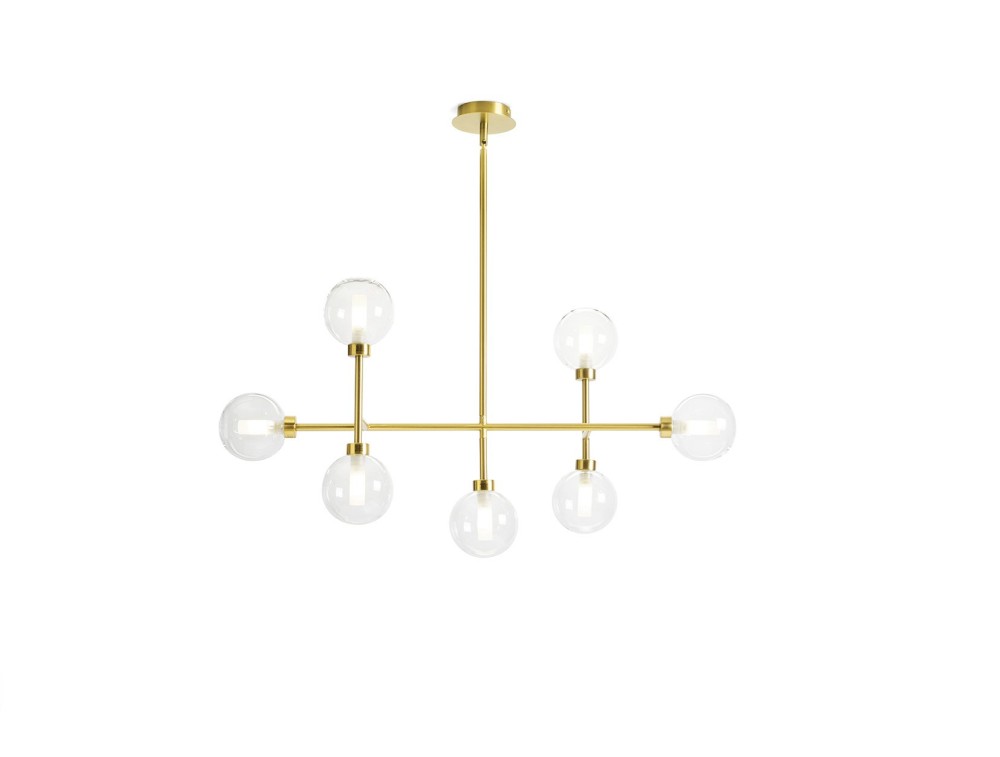 Die Struktur ist ideal für die Beleuchtung eines Wohnzimmers oder Wohnzimmers im zeitgenössischen Stil und besteht aus elegantem und raffiniertem Metall aus gebürstetem Goldmessing mit abgerundeten Linien, begleitet von transparenten Glaskugeln mit weißem Glas im Inneren, die die Glühbirnen verbergen. Dank der G9-Fassungsbefestigung kann der Kunde durch den separaten Kauf der Leuchtmittel selbst über Lichtfarbe, Leistung oder Dimmbarkeit entscheiden. Die Dom-Kollektion der italienischen Kronleuchtermarke Miloox hat die gesamte Kollektion erweitert, um Wand- oder Deckenkombinationen auch in sehr großen Räumen zu ermöglichen.