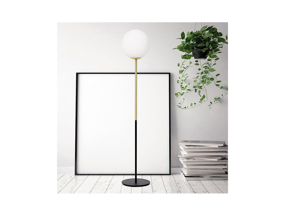 Minimale Stehleuchte, ideal für moderne Möbel und zur Beleuchtung des Wohnbereichs oder Heimbüros. Sie besteht aus milchig weißem mundgeblasenem Glas mit einem Durchmesser von 30 cm und einem bemalten Rahmen. Dank des Dimmers verändert diese Stehleuchte die Lichtintensität je nach Bedarf.