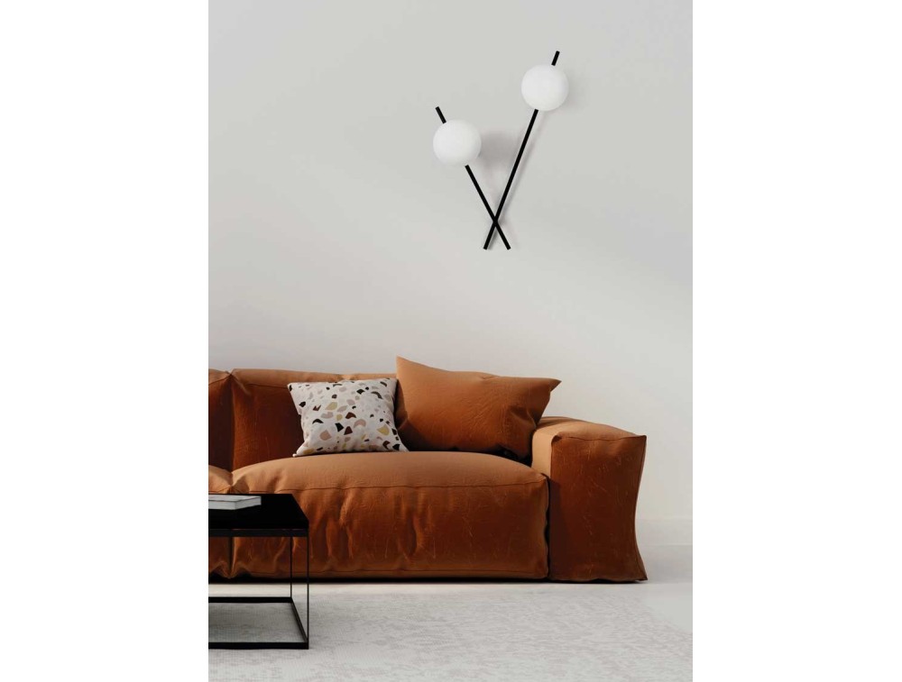 Die Kugelform der beiden Diffusoren mit einem Durchmesser von 14 cm aus milchig weißem geblasenem Glas gibt ein diffuses und homogenes Licht in die Umgebung und an die Wand.