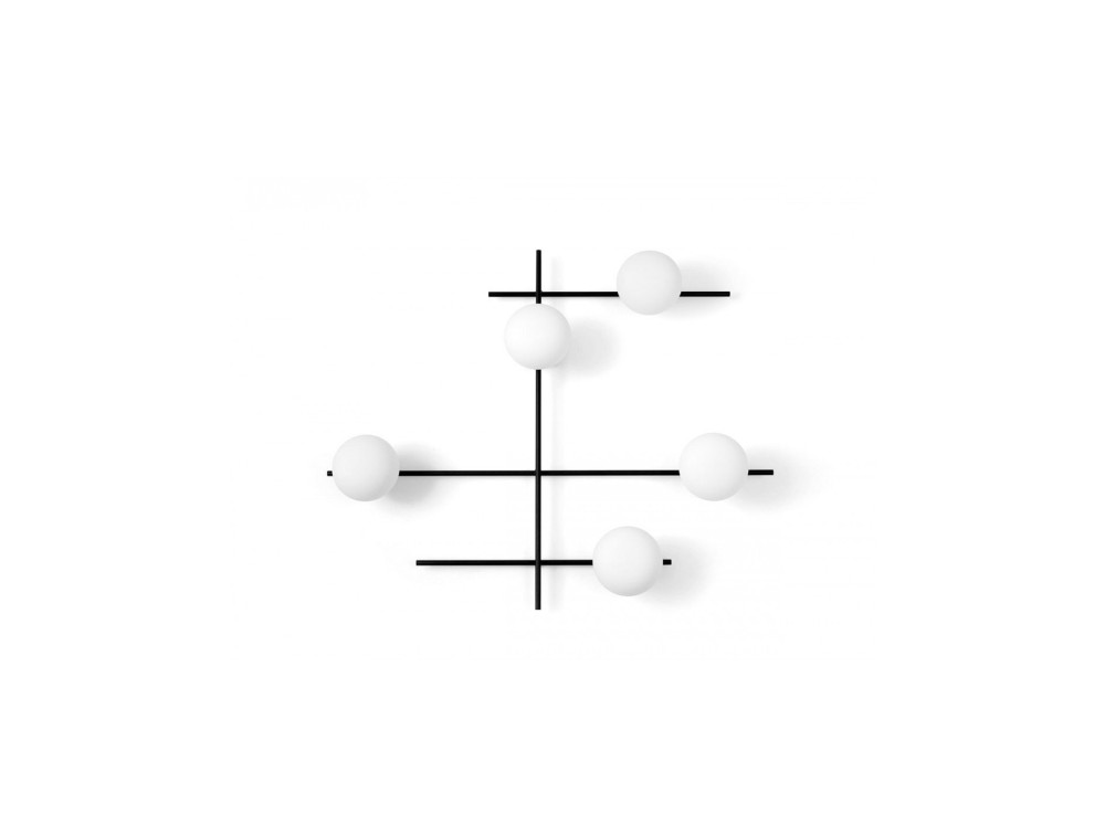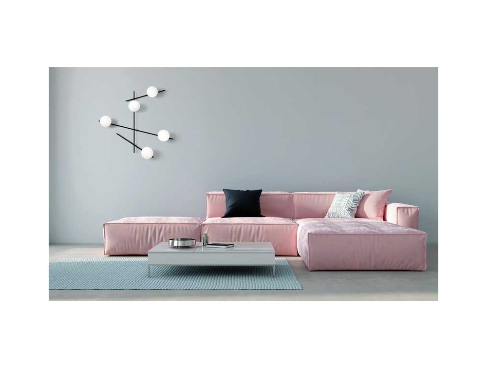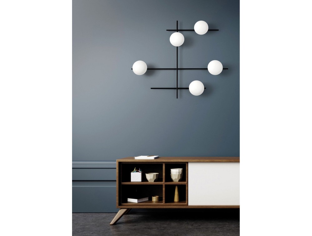 Eine Wandleuchte mit einer Struktur aus vier Armen, von denen drei gedreht werden können, wobei die sekundären Arme durch die Wahl zwischen zwei Konfigurationen gedreht werden können. Die Struktur besteht aus schwarz lackiertem Metall, während die Diffusoren eine kugelförmige Form haben und vollständig aus milchweißem Glas bestehen. Die schalenförmige Form der 5 Diffusoren mit einem Durchmesser von 14 cm verteilt das Licht in der Umgebung und an der Wand, auch in der Variante mit transparenten Kugeln erhältlich.