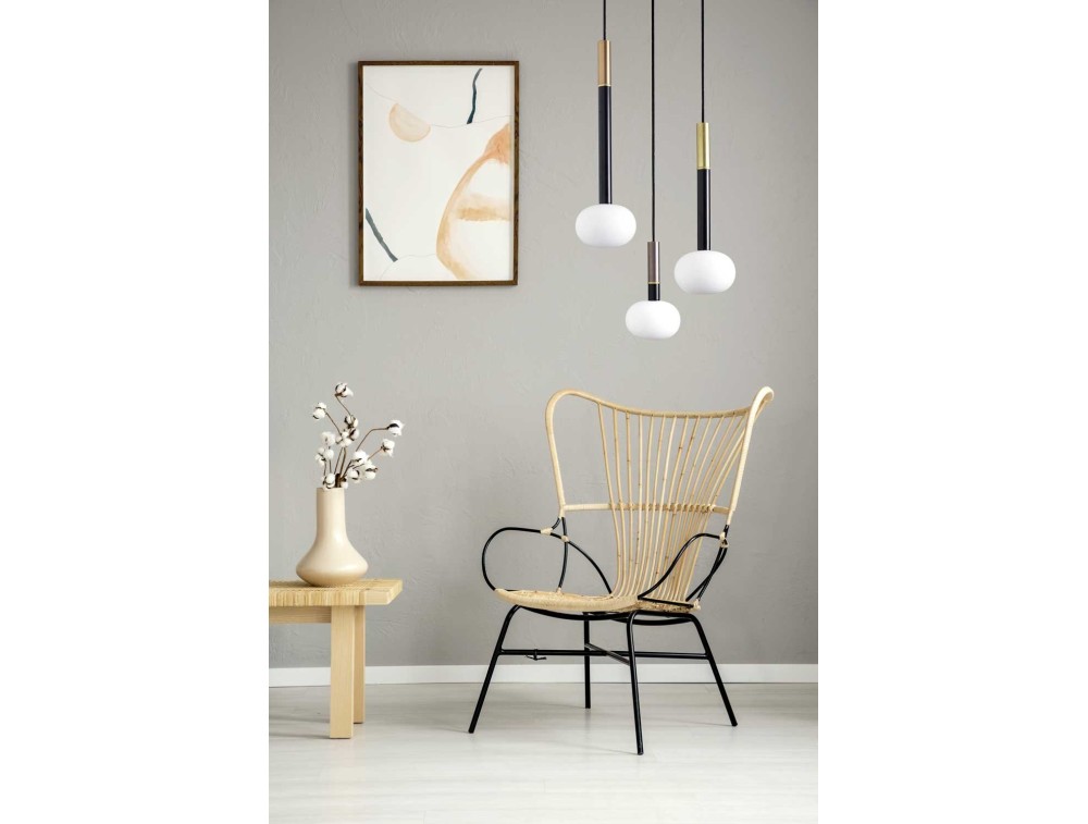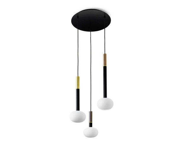 3-flammige Pendelleuchte aus mundgeblasenem Glas in Milchweiß. Schwarz lackierter Rahmen und Details in gebürstetem Kupfer, gebürstetem Gold und gebürsteter Bronze. Schwarze Stromkabel mit einer maximalen Länge von 200 cm und schwarzem Deckenbaldachin. Einbaubare G9-LED-Glühbirne.