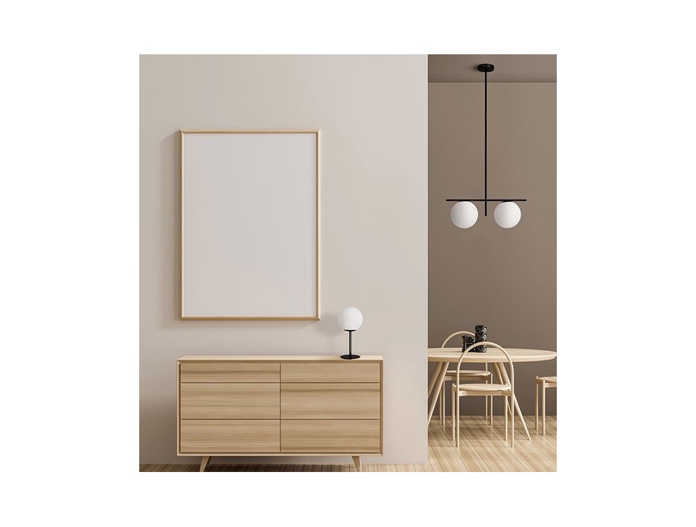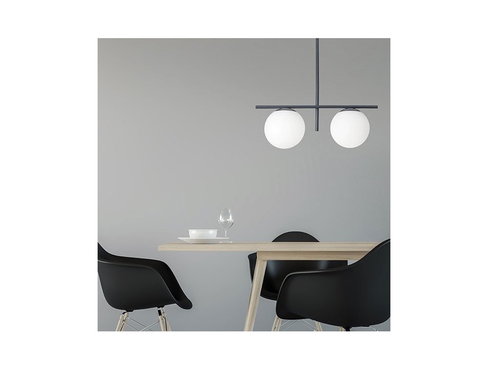 Es handelt sich um einen Kronleuchter mit zwei kugelförmigen Diffusoren aus mundgeblasenem Glas mit einem Durchmesser von Ø20 cm, der aus einer Struktur mit einem bemalten kreuzförmigen Metallrahmen besteht, an dem die beiden Kugeln befestigt sind.