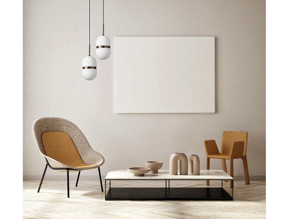 Mit seinen geometrischen Formen ist das zentrale Stück aus milchig weißem geblasenem Glas an einem eleganten Bronzeträger aufgehängt. Ein bronzefarbener Metallring umschließt sanft das Glas