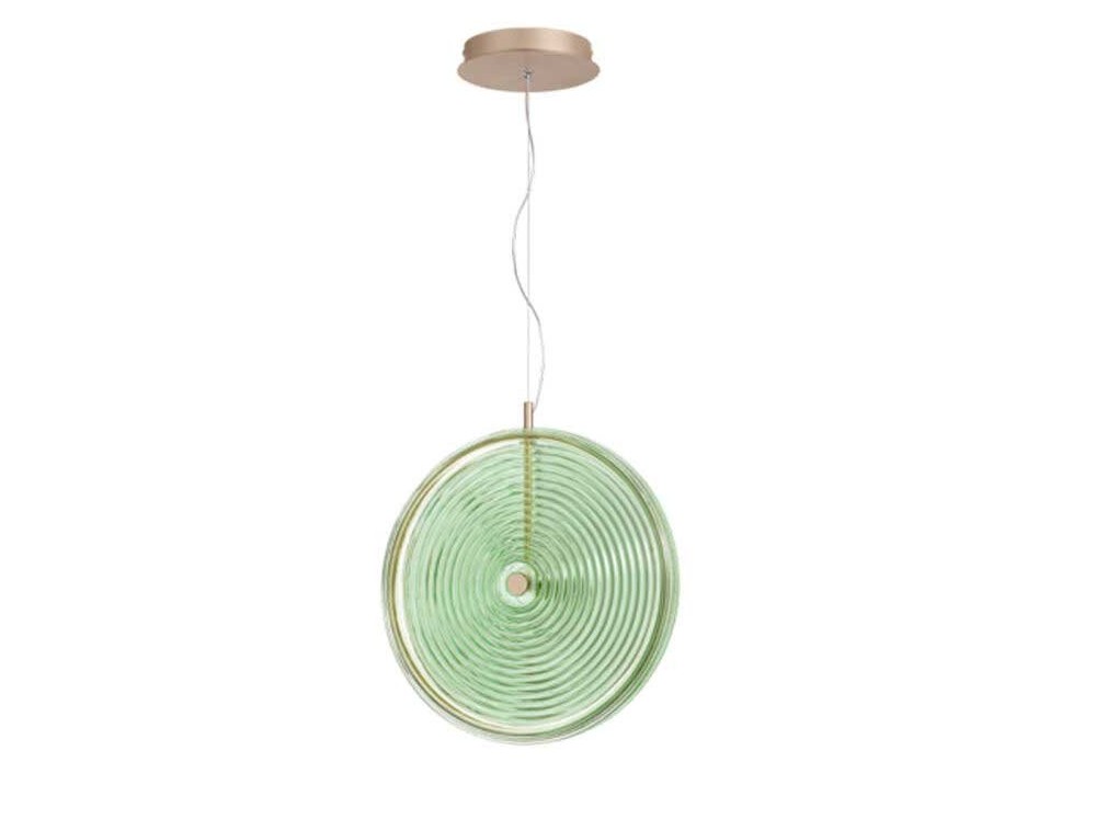Designer-Hängelampe aus gestreift dekoriertem Glas und goldlackierter Metallstruktur. Glas in verschiedenen Farben erhältlich.
