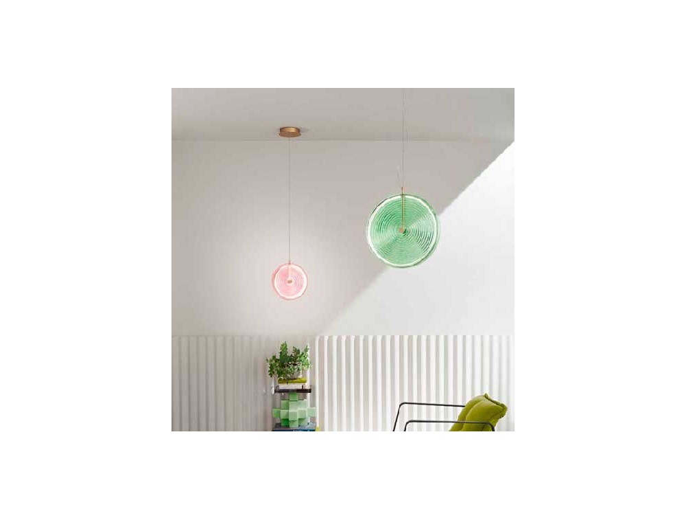 Präsentiert auf der EUROLUCE 2023 ist Jokey eine LED-Kollektion aus lackiertem Metall und Glas, die mit konzentrischen Linien verziert ist. Rahmen aus goldfarben lackiertem Metall. Erhältlich in Einzel- oder Mehrfachversion. Kabel längenverstellbar