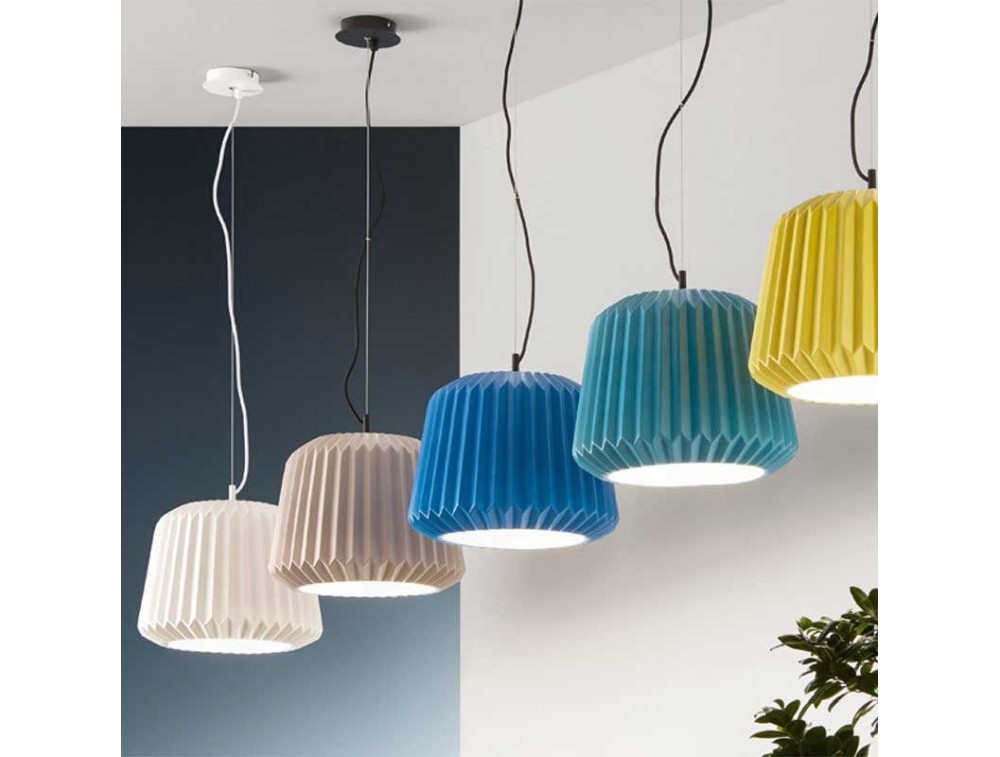Diese Lampe aus der Plumcake-Serie zur Beleuchtung eines Küchentisches besteht aus ganz besonderer gewellter Keramik und kann auch in verschiedenen Farben kombiniert werden, um ein sehr originelles Farbspiel auf der Arbeitsplatte zu erzeugen. Es besteht die Möglichkeit, LED-Leuchtmittel einzusetzen und die Höhe des Diffusors je nach Bedarf anzupassen, das Gewicht beträgt ca. 5 kg.