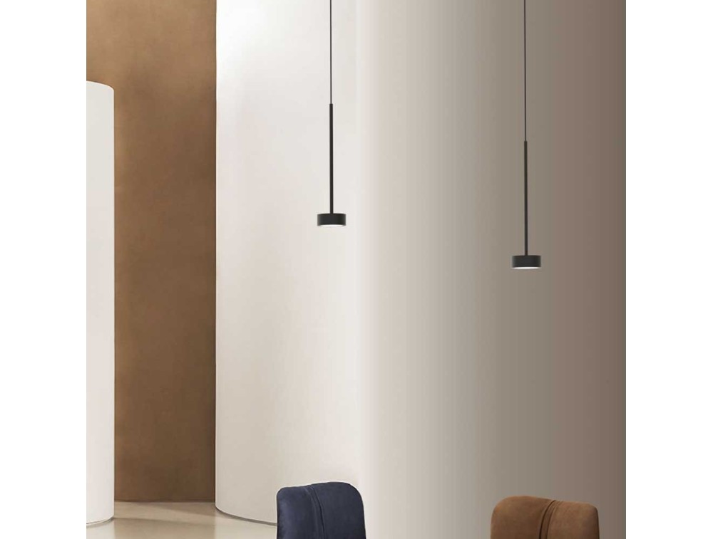 Eine hochmoderne Pendelleuchte, die den Raum erhellt und gleichzeitig dekoriert. Die Leuchte verfügt über ein schwarzes Metallgestell.