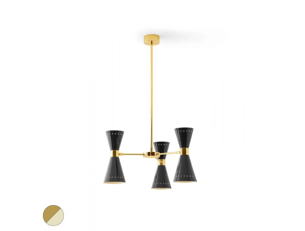 STILNOVO MEGAFONO Hängeleuchte bestehend aus einem Messingkörper, einem Lampenschirm und einem Metallsockel. Ausführungen: Messing mit galvanischer Vergoldung, schwarzer oder elfenbeinfarbener Lampenschirm. Megafono ist eine ikonische Lampe aus den 1950er Jahren mit direktem und indirektem Licht.