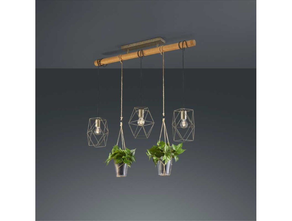 Die Hängeleuchte PLANT von Trio Lighting besteht aus einer rechteckigen Platte aus antikem Nickelmetall, einem Holzstab mit drei Kabeln, die Metallkäfig-Lampenschirme tragen, und Seilkabeln, die dekorative Topfpflanzen tragen, die als dekorative Elemente dienen. Jedes Kabel ist individuell in der Länge verstellbar, sodass Sie die Höhe der Lautsprecher an Ihre Beleuchtungsbedürfnisse anpassen können. Es ist möglich, 3 Glühbirnen mit E27-Anschluss von maximal 40 Watt zu installieren (separat erhältlich). Die LED-Leuchtmittel garantieren eine hervorragende Lichtausbeute und einen geringen Energieverbrauch. Eine Hängeleuchte mit modernem und raffiniertem Design, ideal für die originelle Beleuchtung und Einrichtung der Küche oder des Wohnzimmers.