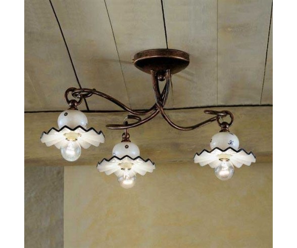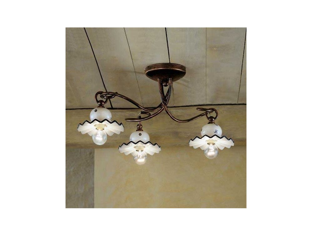 Rusty-Deckenleuchte mit Metallstruktur und glänzendem Keramik-Schirm, dekoriertes Gegengewicht. Lampe mit Diffusor, angereichert mit einem handgemalten Motiv, das dank seiner detaillierten Linienfarben in jedem Zentimeter von Hand ein raffiniertes Deckchen, elegantes und raffiniertes Design wiedererkennt. Auf Wunsch ist es möglich, die Dekoration nach den persönlichen Bedürfnissen und Geschmäcken des Käufers zu haben.