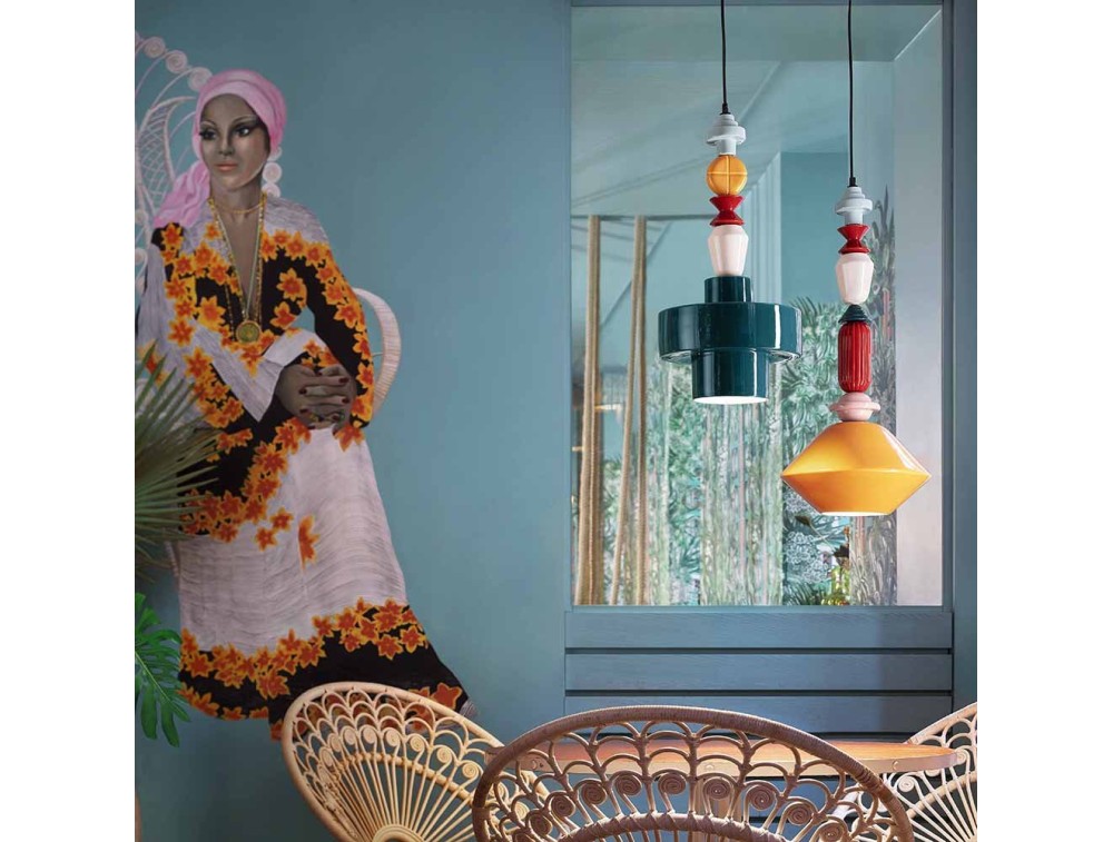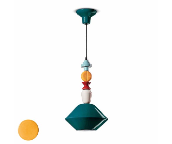 Dekorative Pendelleuchte komplett aus Keramik. Wie bei einem Juwel folgen die brillanten Keramikelemente von Lariat vertikal aufeinander und bilden eine bunte, vielfarbige Kette, die sich durch abwechselnde Geometrien fortsetzt, bis sie an ihrem Ende das wertvollste Element erreicht, das das leuchtende Element enthält.