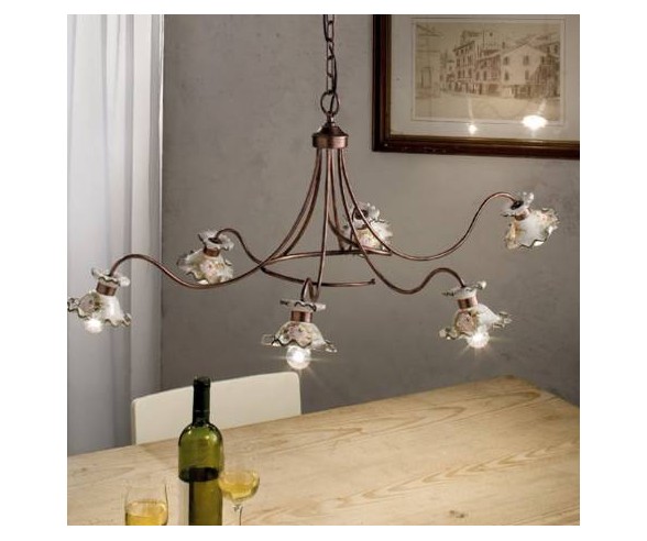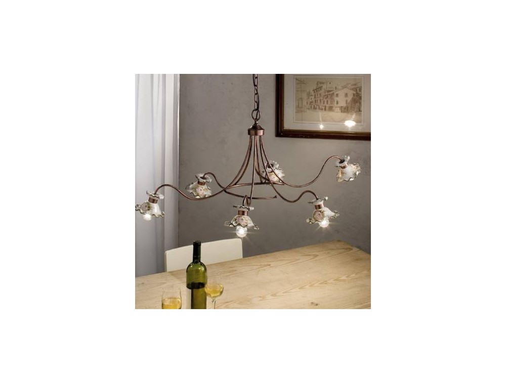 Rusty-Kronleuchter aus polierter Keramik, per Hand mit floralen Motiven und Messingstruktur verziert. Schirm der Lampe mit wellenförmigen und gezackten Kanten, ideal für die Verbesserung einer rustikalen, Messingstruktur. Die Ferroluce-Lampen bieten eine große Auswahl an Dekorationen, die komplett in Handarbeit gefertigt werden, Details, die Sie individuell anpassen können.