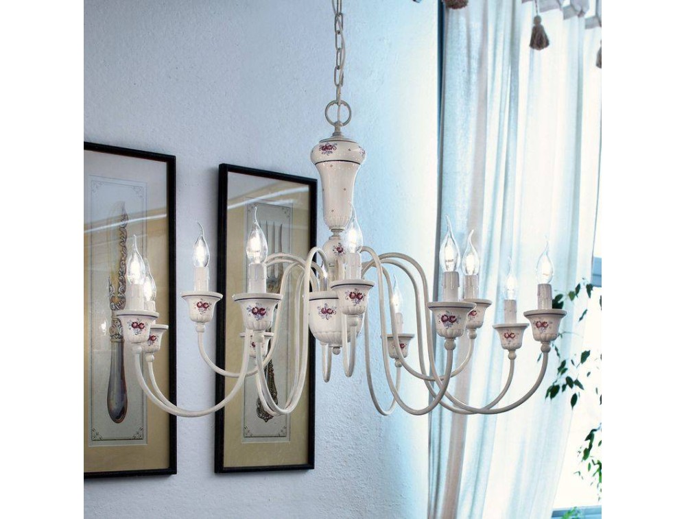 12-Lichter-Rusty-Kronleuchterc aus Keramik ganz per Hand verziert und aus Metallstruktur. Lampe mit einem starken Rusty-Stil, die in jedem Raum des gleichen Design-Stils gestellt werden kann. Seine farbigen Details auf weißer Keramik geben der Wandleuchte einen weiteren Hauch von Raffinesse und Eleganz. Die Dekorationen sind nur zur Veranschaulichung, es ist tatsächlich möglich, sie nach dem Geschmack des Kunden anzupassen.