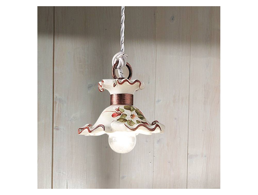 Rusty-Pendelleuchte aus polierter Keramik, per Hand mit floralen Motiven und Messingstruktur verziert. Schirm der Lampe mit wellenförmigen und gezackten Kanten, ideal für die Verbesserung einer rustikalen, Messingstruktur. Die Ferroluce-Lampen bieten eine große Auswahl an Dekorationen, die komplett in Handarbeit gefertigt werden, Details, die Sie individuell anpassen können.