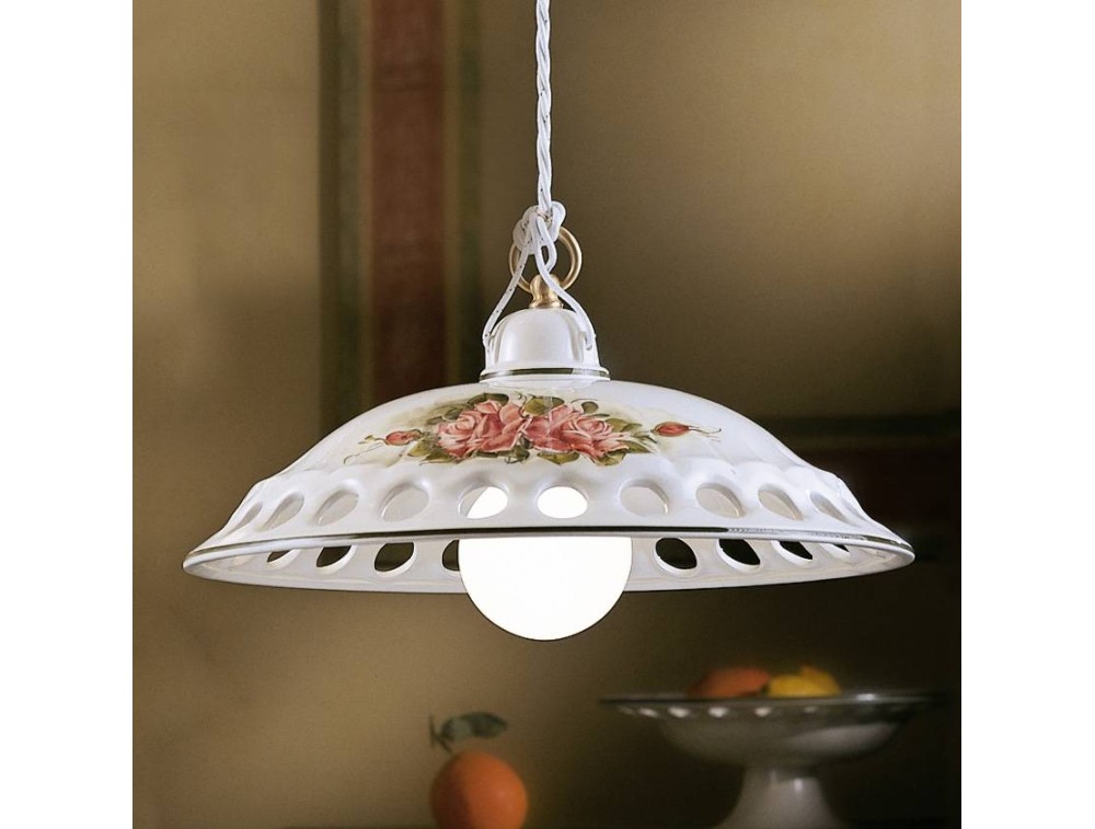 Rusty-Pendelleuchte mit Schirm aus Keramik per Hand verziert und Metallstruktur, Band nicht enthalten. Lampe mit gewundenen Linien. Dank der Löcher entlang des gesamten Schirms der unteren Kante des Diffusors, ist es möglich, die Lampe mit farbigen Bändern entsprechend den Farbtönen in der Wohnumgebung des Kunden zu schmücken. Die Details auf Keramik sind ganz handgefertigt, das ist weil Sie sie auf Anfrage anpassen können.