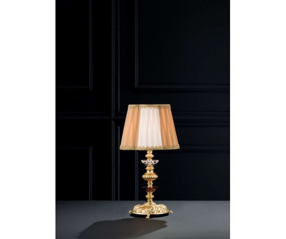 Tischlampe mit Messingstruktur aus Blattgold mit Anhängern und Sholer-Kristall-Details. Lampe mit klassischem Design dank der Struktur in Blattgoldoptik und Details aus bernsteinfarbenem Sholer-Kristall. Kronleuchter sorgen für ein effektvolles Licht in der Umgebung, in der er sich befindet, und verleihen ihm Bedeutung und Eleganz.