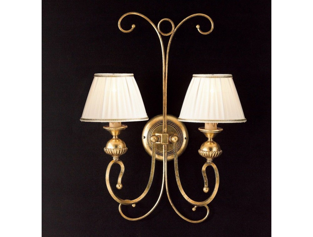 Wandleuchte im klassischen Design aus Schmiedeeisenstruktur in Goldoptik und Lampenschirm mit Goldschnur. Lampe mit einer essentiellen und eleganten Linie. Die subtile und geschwungene Struktur passt sich jeder Umgebung des gleichen Möbelstils an und beleuchtet sie dank des Stoffschirms mit einem dezenten weichen Licht. Ideal in Wohnräumen, Fluren, Eingängen, Schlafzimmern und Wohnbereichen