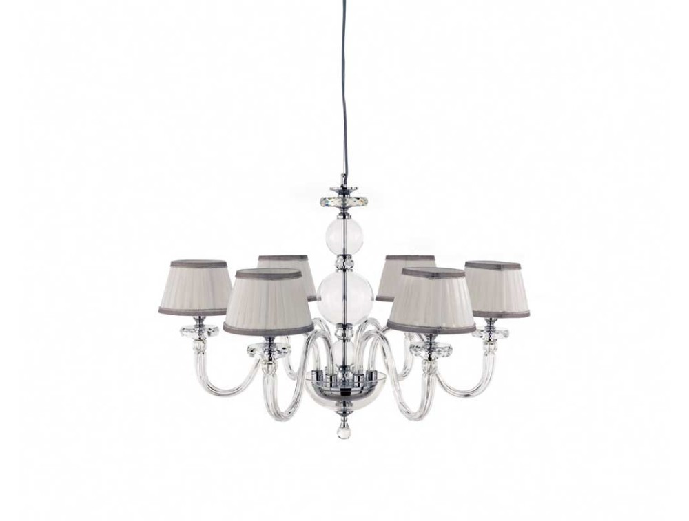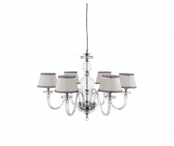 Ciciriello, Kronleuchter aus handgearbeitetem transparentem Glas. Metalldetails, erhältlich in zwei Farben. Stahlseile in der Länge verstellbar. Schirme können separat erworben werden. Der Kronleuchter ist ideal für alle Arten von Umgebungen wie Schlafzimmer, Wohnzimmer, Flure oder Eingänge.