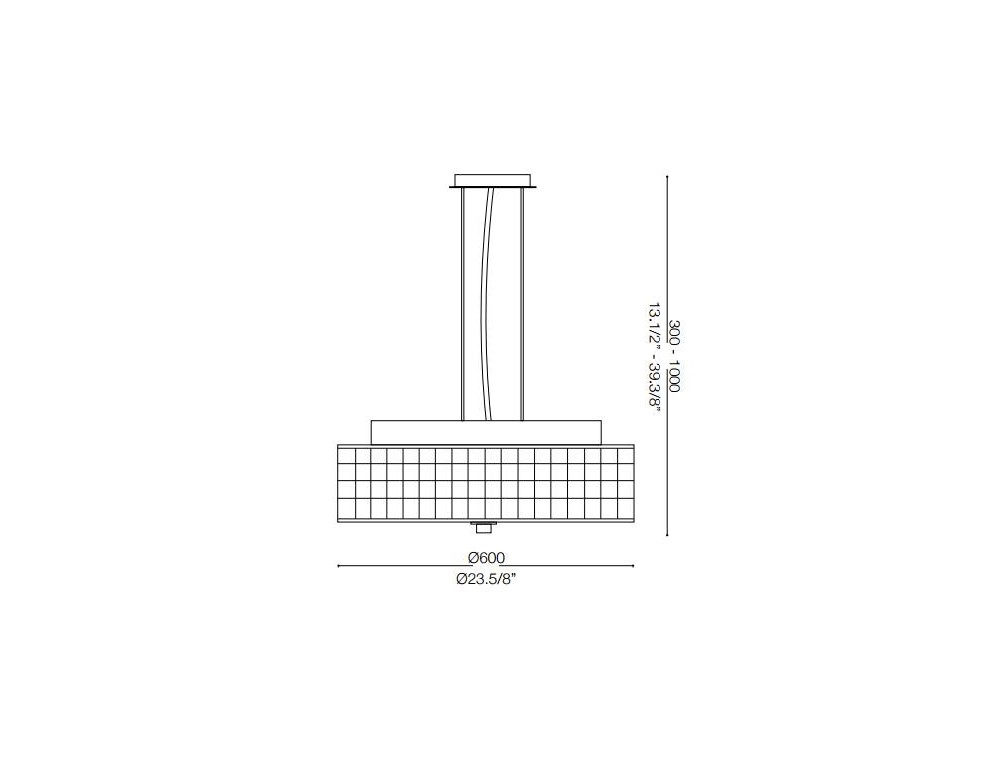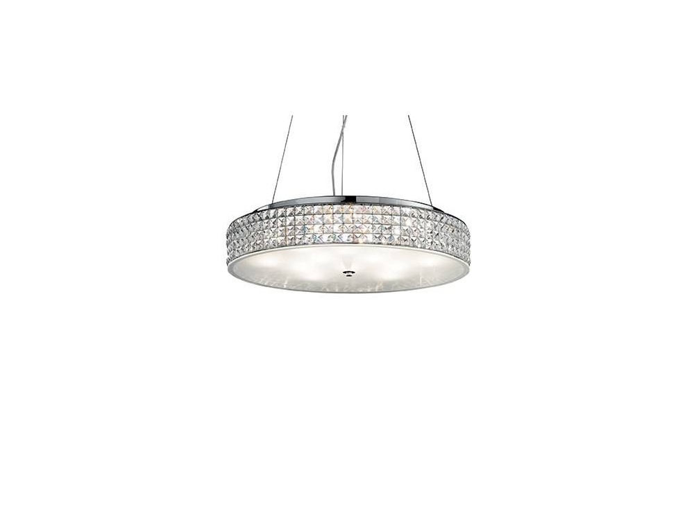 Pendelleuchte aus verchromtem Metallstruktur- und Details. Der Diffusor ist mit gemahlenen Kristallelementen angereichert und am Ende durch ein sandgestrahltes Glas verschlossen. Eine Leuchte, die sich dank ihrer eleganten und raffinierten Linie besonders für Wohn- und Schlafräume eignet.