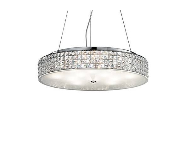 Ideal Lux Pendelleuchte mit verchromtem Metallrahmen und Details. Diffusor mit quadratischen Elementen aus geschliffenem Kristall auf dem Seitenband und sandgestrahltem Glas auf dem Boden. Pendelleuchten mit längenverstellbaren Kabeln. Inklusive Glühbirnen.