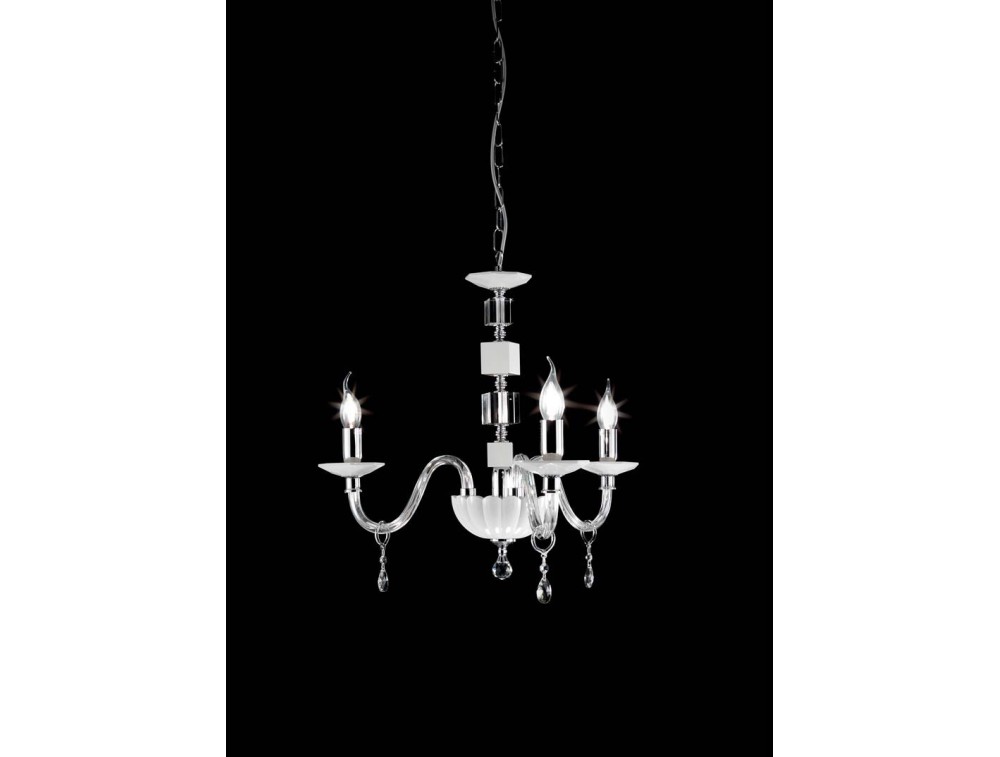 Kronleuchter mit Struktur aus Glas und Milchweißem und transparentem Kristall, Details aus verchromtem Metall. Lampe mit einem hellen und raffinierten Design mit einer Glas- und Kristallstruktur, durch die das Licht der Lichtquellen auch durch das milchig weiße und transparente Farbe besonders hervorgehoben wird. Erhältlich bei 6 oder 8 Leuchten.