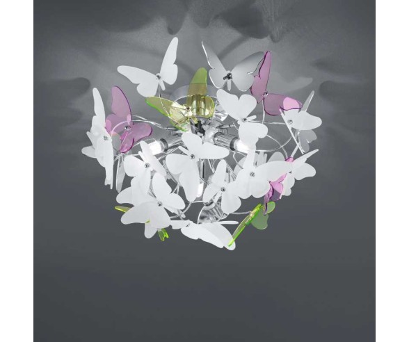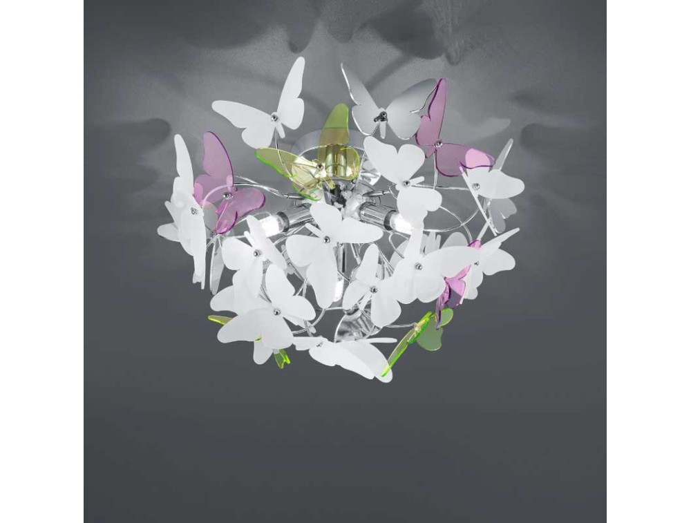 Die Deckenleuchte BUTTERFLY von Trio Lighting besteht aus einer verchromten Metallstruktur mit einem Diffusor, der mit mehrfarbigen Kunststoffschmetterlingen verziert ist. Es besteht die Möglichkeit, 3 Leuchtmittel mit G9-Anschluss max. 28 Watt zu installieren (separat erhältlich). Diese zarte und elegante Aufhängung eignet sich für verschiedene Arten von Räumen in Ihrem Zuhause. Perfekt für das Schlafzimmer eines kleinen Mädchens.