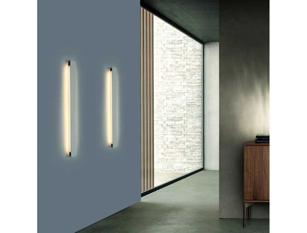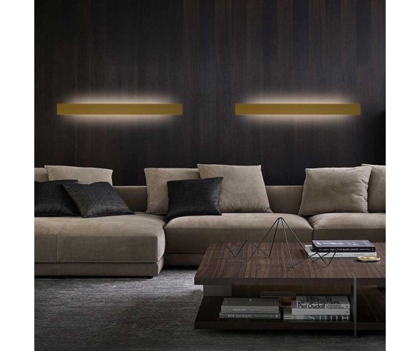 Die Wandleuchte FOSCA der Marke ACB hat eine lineare rechteckige Struktur aus schwarzem, weißem oder strukturiertem Goldmetall.
