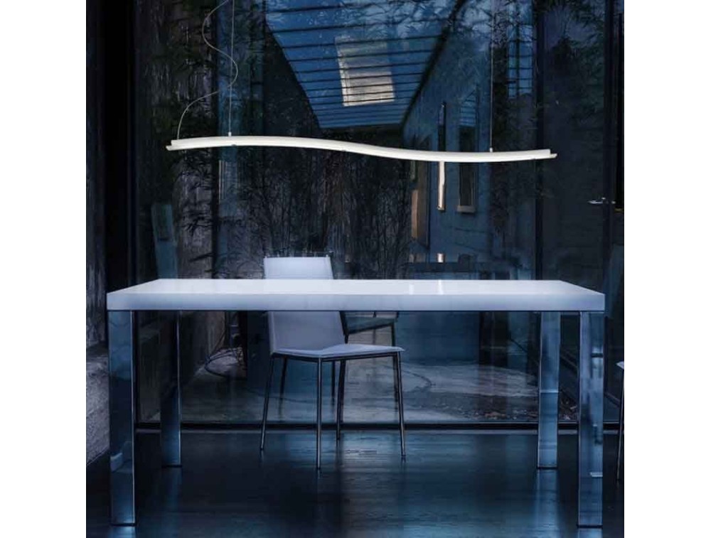 Minimale Pendelleuchte in seinen Abmessungen und kurvige Form. Eine Pendelleuchte mit LED-Lichtquelle mit einzigartigem Touch, die die gesamte Oberfläche jeder Unterlage gleichmäßig beleuchtet. Die Pendelleuchte der Metrica-Kollektion von Braga Beleuchtung ist ein Made in Italy-Produkt, das Qualität und Funktionalität garantiert.