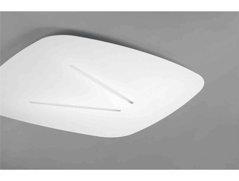 Deckenleuchte aus lackiertem Metallstruktur erhältlich in corten, sandfarbe, grau oder weiß. Lampe aus innovativem und vielseitigem Design dank der quadratischen Linie ihres Schirms, die stumpfe Winkel hat. Der Schirm strömt seinen LED-Lichtstrahl durch die "Stick" Öffnungen aus, das heißt durch die Linien, die auf ihn gesetzt werden. Ideale Lampe in Umbgebungen aus modernem und linearem Design.
