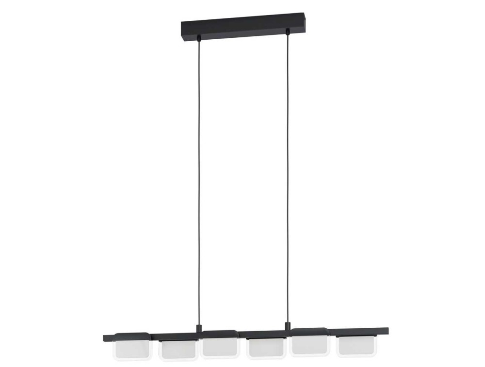 Die ERVIDEL LED-Pendelleuchte besteht aus einem schwarzen Metallbaldachin, an dem ein langer Metallträger in der gleichen Farbe angebracht ist, auf dem sechs Leuchtkörper aus satiniertem Acryl abwechselnd angeordnet sind. Die integrierten LEDs geben ein angenehm warmweißes Licht ab und sind über einen speziellen Drehdimmer zur Wand dimmbar. Diese Pendelleuchte im minimalistischen Stil fügt sich perfekt in moderne Einrichtungsstile ein und bietet eine besondere Beleuchtung im Wohn- oder Esszimmer, positioniert über dem Esstisch.