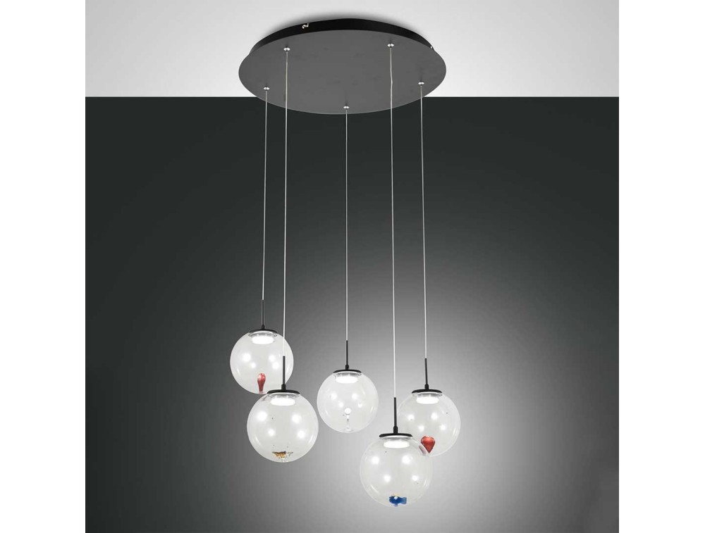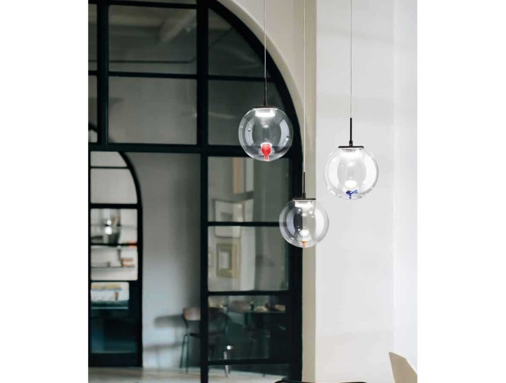 Kronleuchter bestehend aus einer Metallstruktur und einem Diffusor aus Borosilikatglas mit dekorativen Effekten im Inneren. Die Lampe ist LED-verdrahtet und über einen normalen Lichtschalter über 3 Helligkeitsstufen dimmbar.