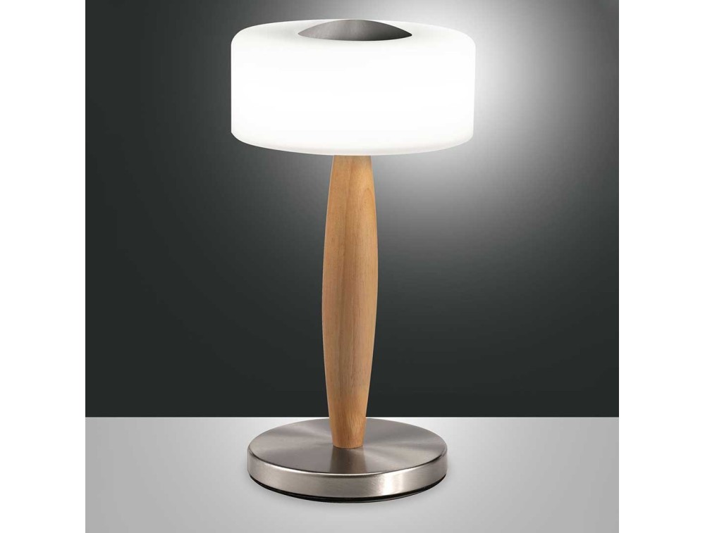 Tischlampe bestehend aus einer Metall- und Holzstruktur; Diffusor aus geblasenem Glas. Sie können die Intensität des Lichts mit einer einfachen Berührung anpassen. Erhältlich in drei verschiedenen Farbkombinationen zur Auswahl: Schwarz, Satin-Messing und Satin-Nickel.