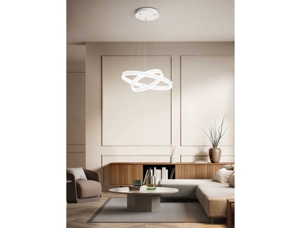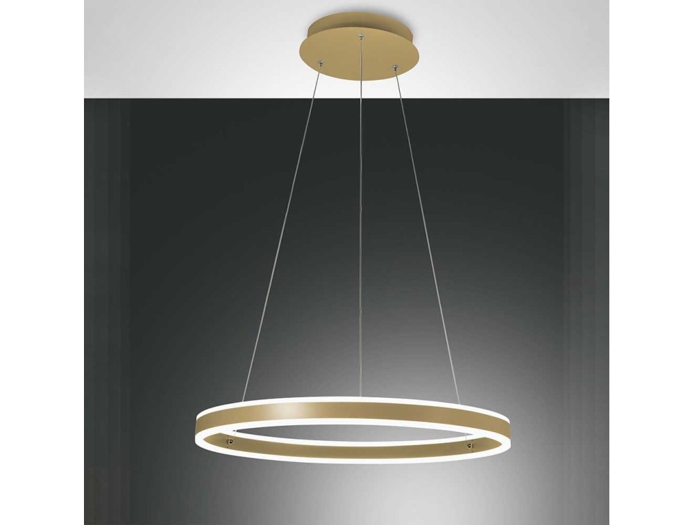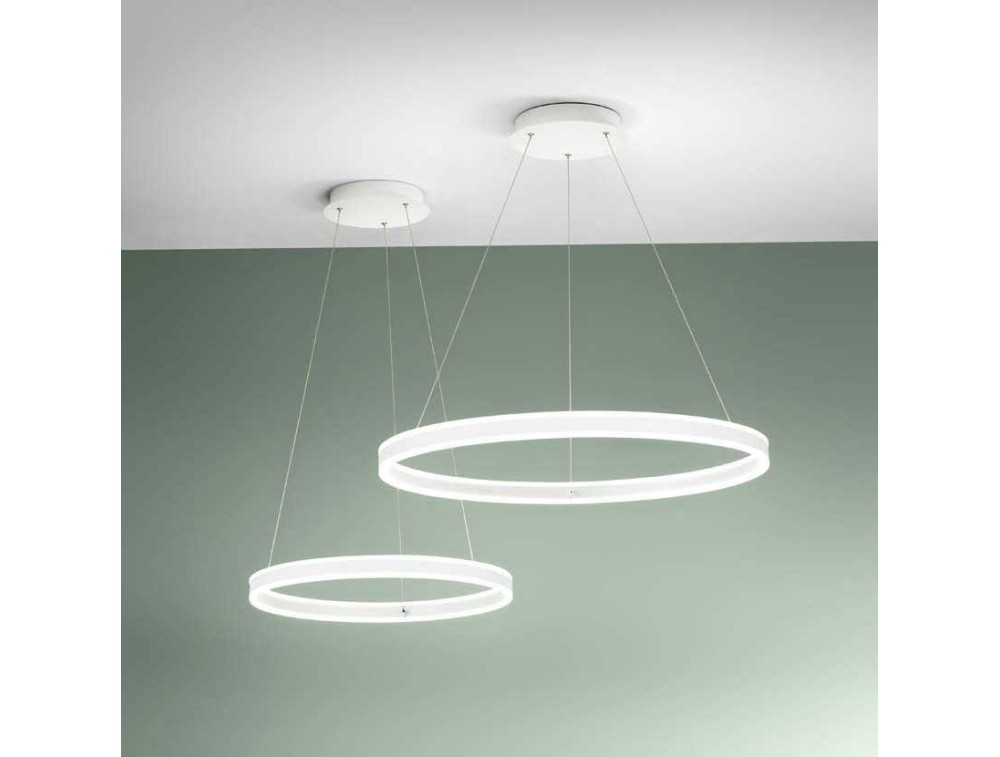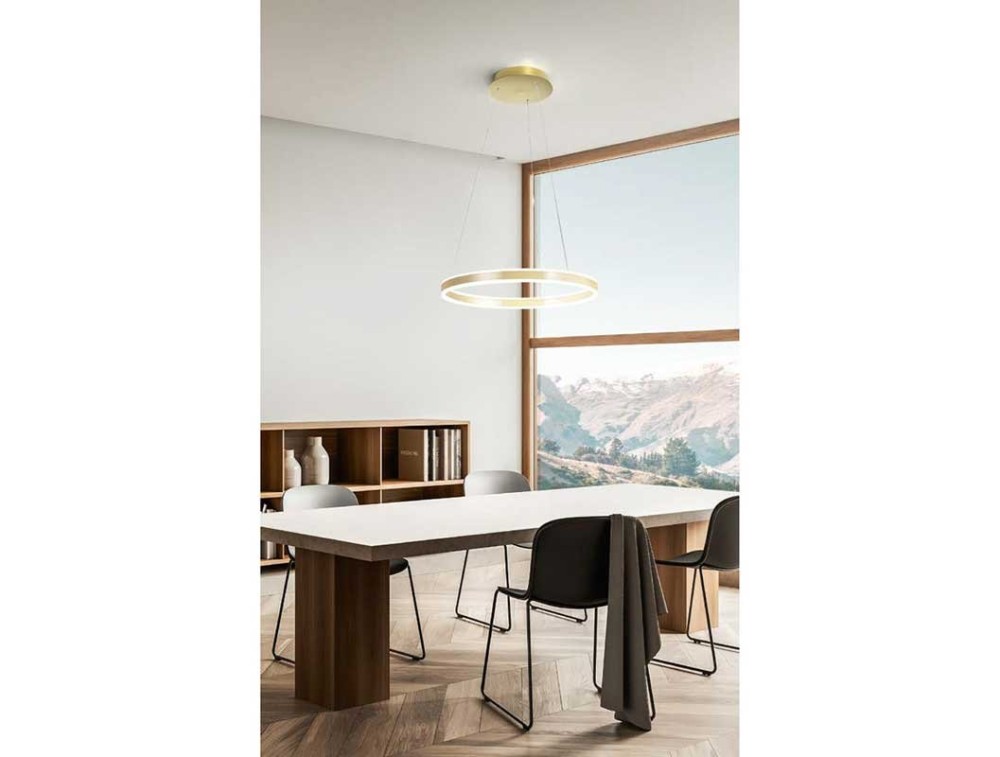 Palau ist eine Hängeleuchte mit ringförmigem Diffusor, erhältlich in den Ausführungen Mattgold oder Weiß. Mit seinem modernen Stil erzeugt dieser Designer-Kronleuchter ein schönes helles Bild und passt perfekt in alle modernen Wohnkontexte. Ideal zur Beleuchtung beispielsweise eines Esszimmers oder eines Wohnzimmers. Dank der LED-Quellen sorgt sie für ein warmes und einladendes Licht, dessen Intensität angepasst werden kann.