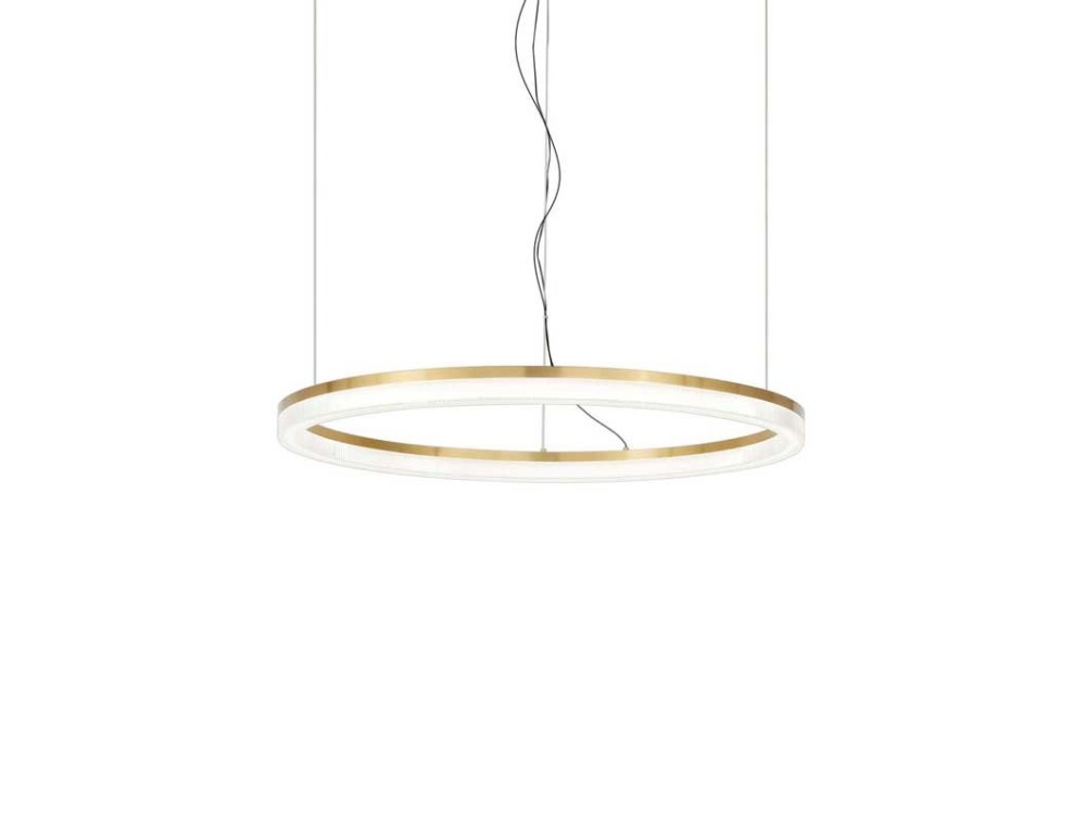 Rosette und Rahmen aus Metall mit gebürstetem Messingfinish. Schwarzes PVC-Kabel. Opaler Acryldiffusor mit transparentem Acryldekorelement mit geschliffenem Kristalleffekt.