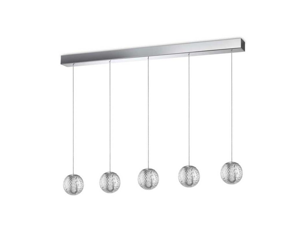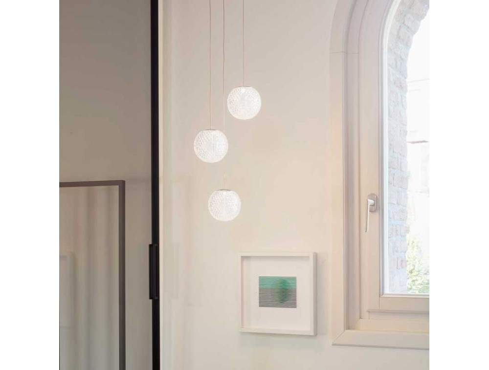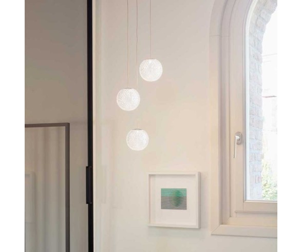 Rosette aus verchromtem Metall. Transparentes Teflonkabel. Transparente Acryldiffusoren mit geschliffener Kristalleffektverarbeitung.